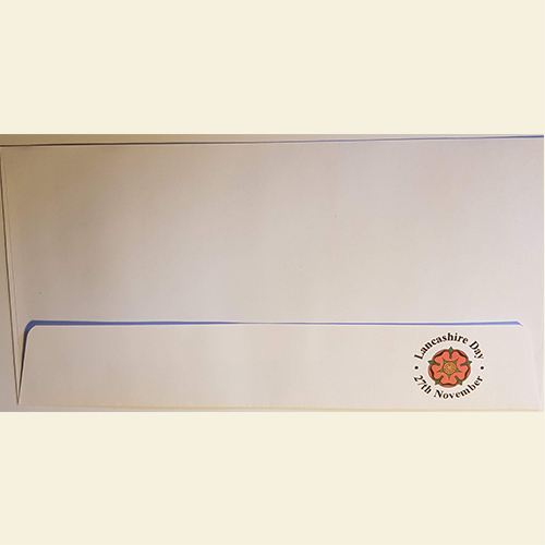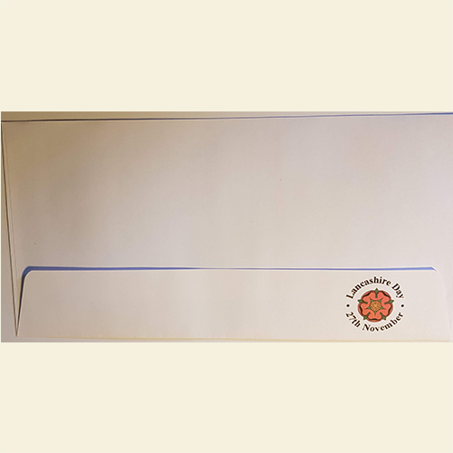 Everyday DL 110 x 220 mm 90 gsm Self Seal Wallet Envelopes – White with FORL logo on front and Red Rose with Lancashire Day, 27th November on rear.