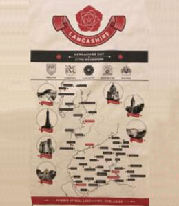 This is a ‘Tea’ or ‘Pot’ Towel specially designed for Friends of Real Lancashire, depicting a map of Lancashire and black and white pictures of places of interest in Lancashire.